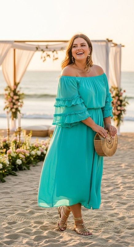 26. Turquoise Off-Shoulder Dress with Ruffles
