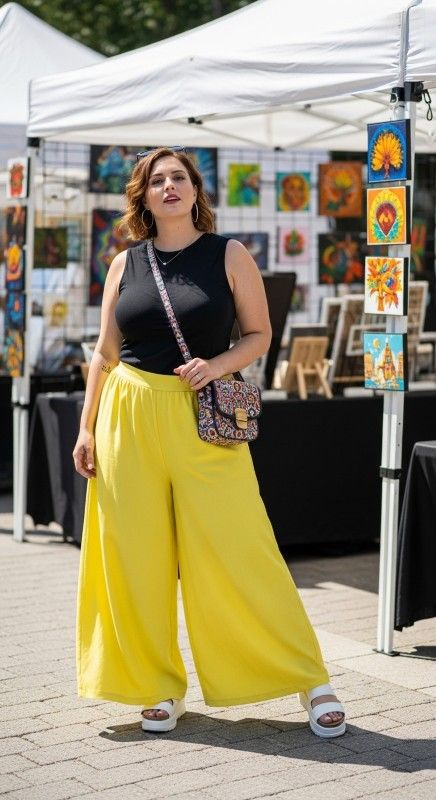 This high-contrast combo is bold but still easy to wear. Palazzo pants keep things breathable.