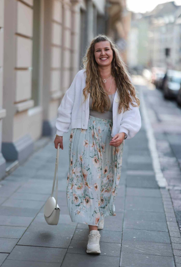I like how soft this outfit feels. The puff sleeves and pastel tones create a gentle feminine look. Lighter prints like this are very flattering in summer because they don’t visually weigh you down.