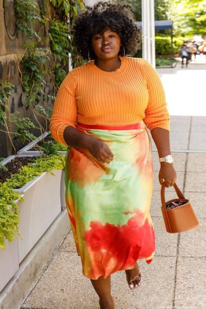I like how this outfit uses color blending instead of heavy patterns. It feels soft but still visually interesting. In real styling terms, warm-toned skirts like this are great for plus-size outfits because they draw attention vertically, which creates a lengthening effect.