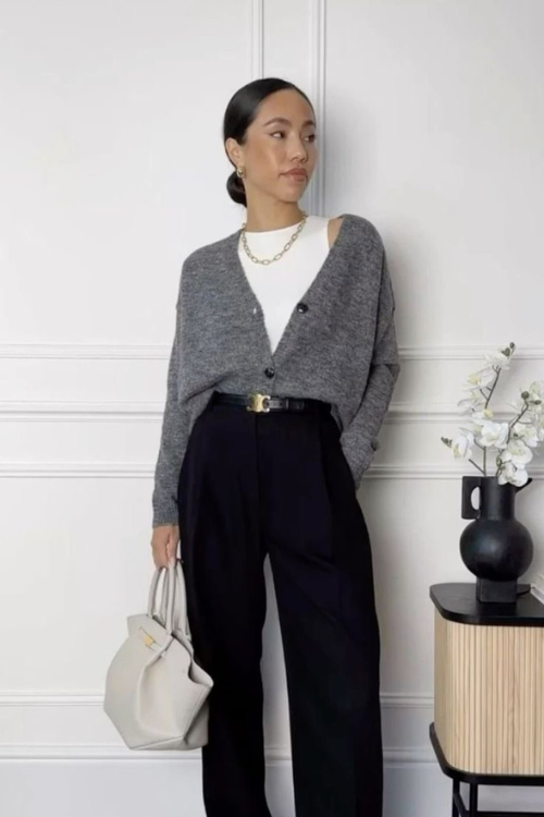 This outfit focuses on comfort paired with polish, showing how layering a cardigan over tailored basics creates a balanced work look.