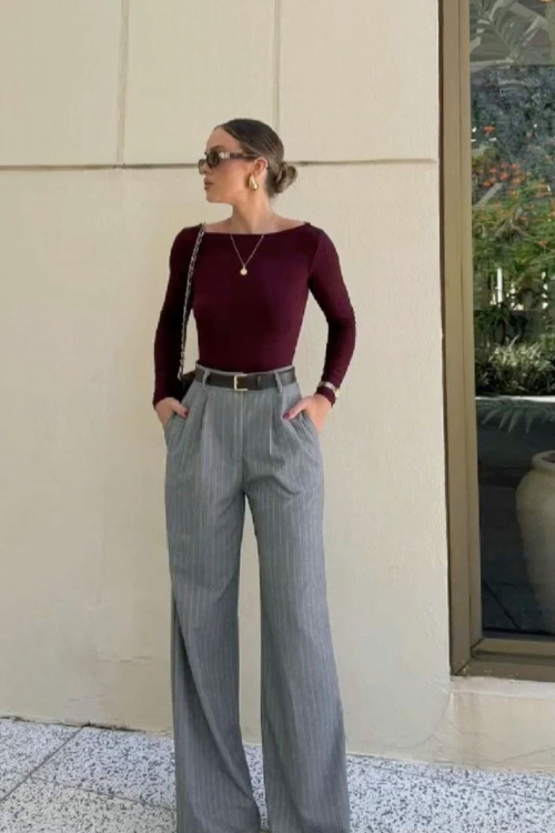 This look offers a refined silhouette that feels professional yet approachable.
