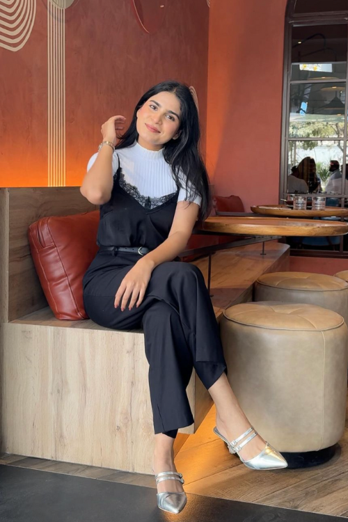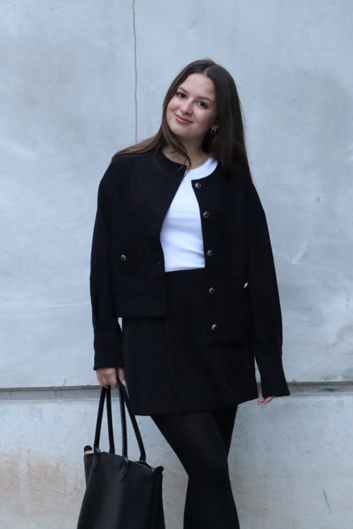 This outfit introduces texture and contrast, blending smooth fabrics with structured layers for a more elevated feel.