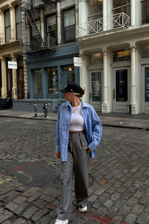 This outfit leans into relaxed tailoring while maintaining a polished finish.