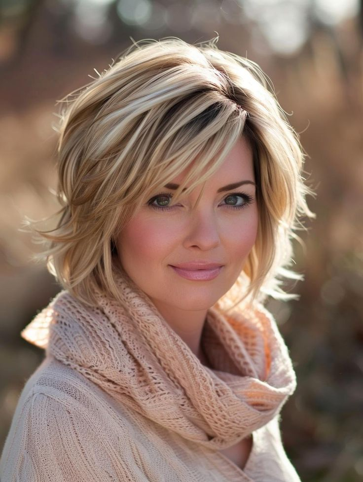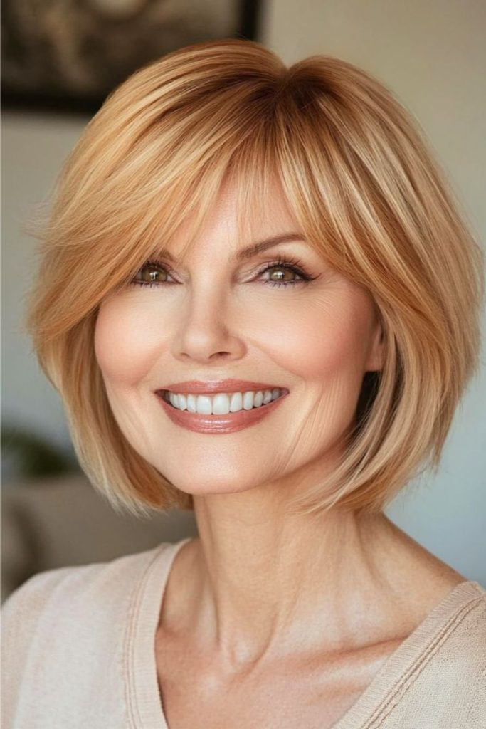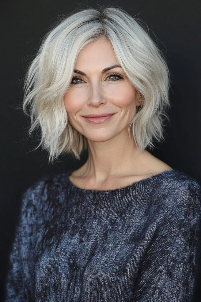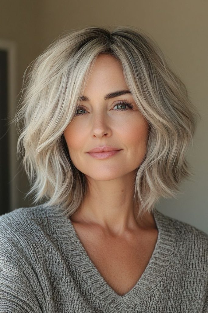 Soft, wavy layers in this bob create a casual, youthful vibe. Sea salt spray and light hairspray keep it effortless and stylish, pairing well with natural makeup and cozy outfits.