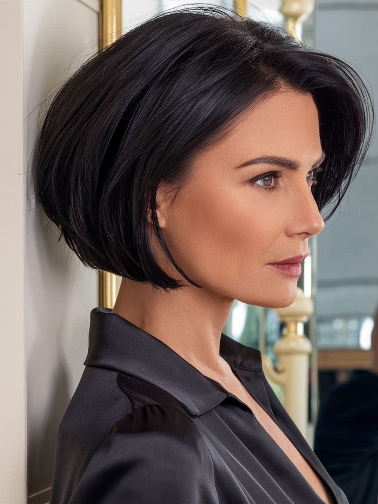 A bold, sharp black A-line bob works well on thick hair, elongating the neck and highlighting the jawline. Perfect for formal or professional settings, it stays sleek with a flat iron and shine serum, complemented by minimal accessories and bold lips.