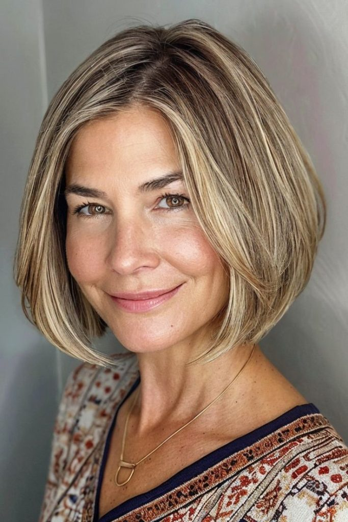 Smooth and polished, the classic rounded bob suits fine hair and grey locks, offering sophistication for any occasion. Blow-dry with a round brush and add shine spray for elegance, paired with simple jewelry for a refined look.