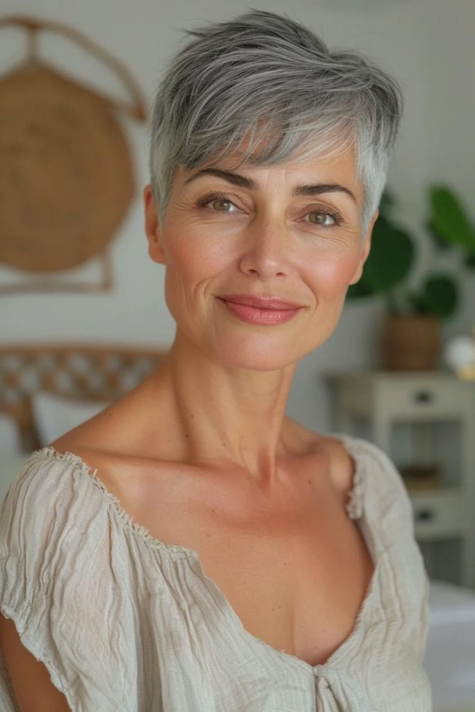 A sleek silver pixie highlights cheekbones and eyes, embracing grey tones with elegance. Smoothing serum keeps it polished, suitable for everyday wear and formal occasions, enhanced with bold lip colors.