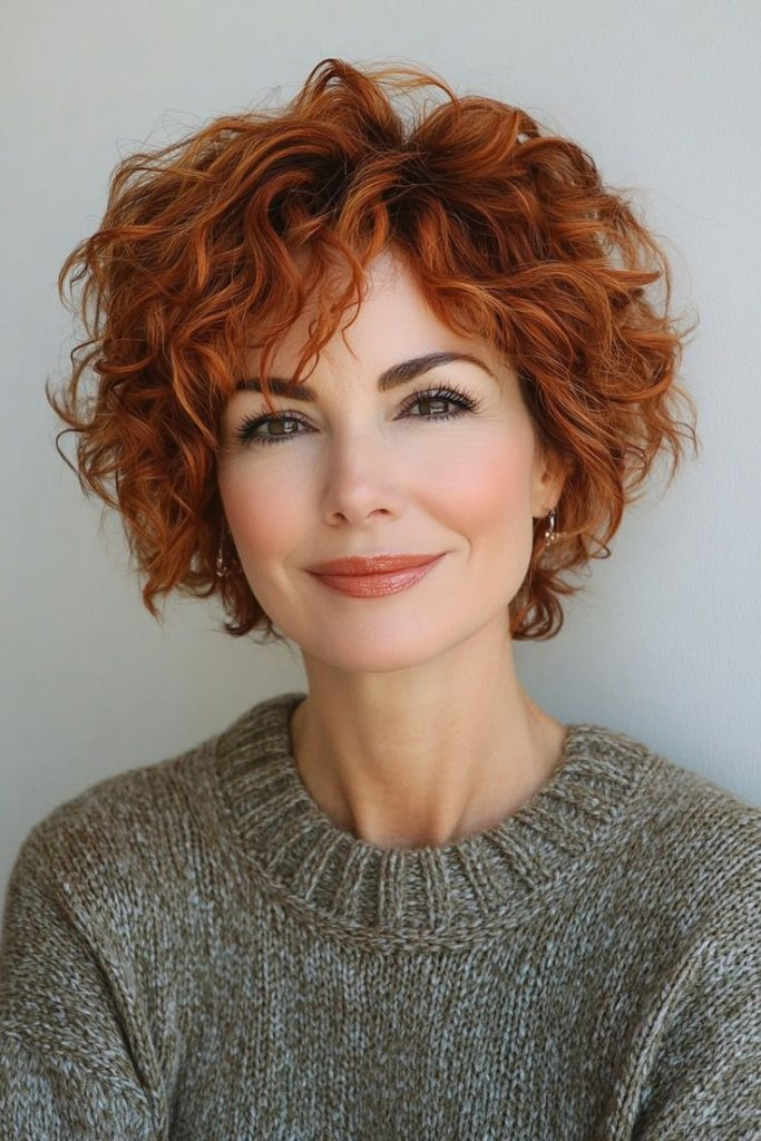 This cropped curly red hairstyle frames the face and keeps curls manageable. It exudes creativity and confidence, maintained with curl-enhancing cream and regular trims. Natural makeup and bold jewelry complete the playful look.