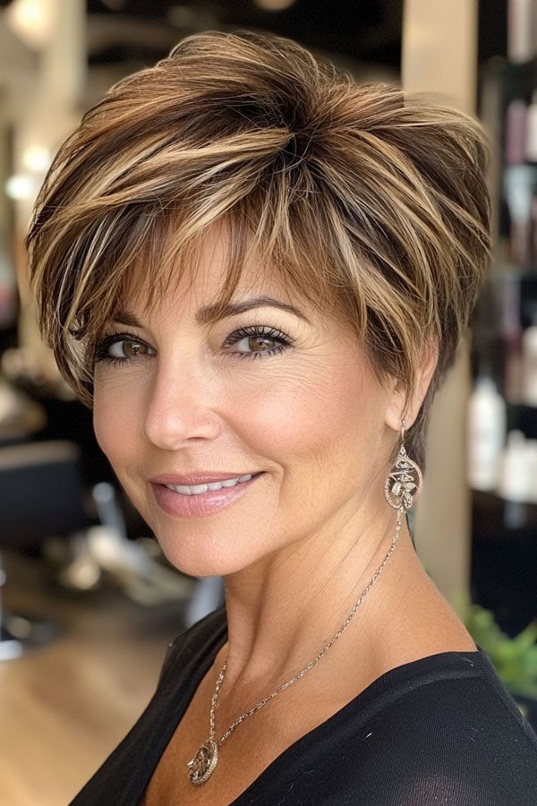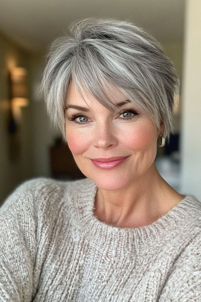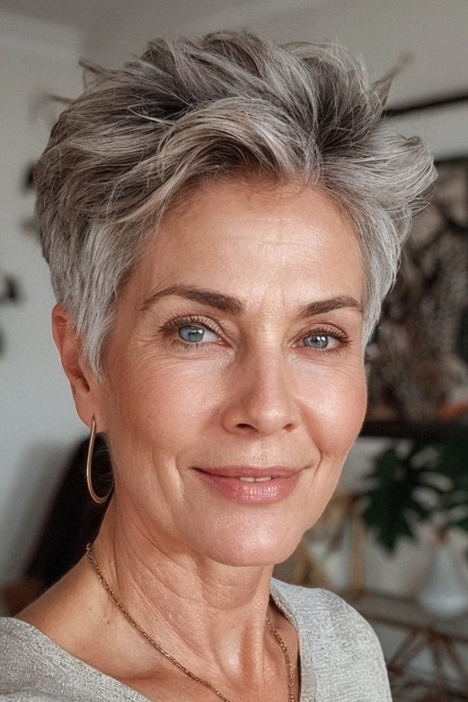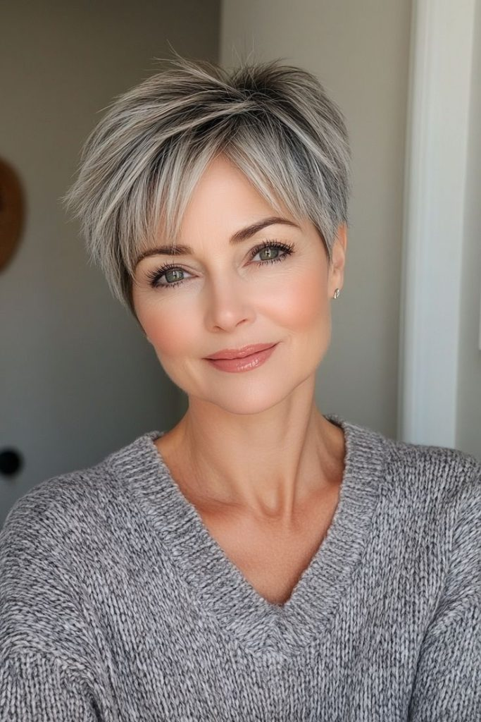 A low-maintenance pixie cut with grey highlights adds texture and dimension. Short layers offer a playful, youthful feel while embracing natural hair color. Texturizing paste enhances the edgy, fresh style.