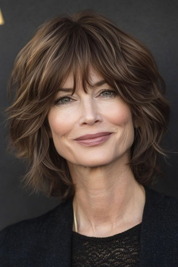 Layered, textured shaggy cut creates a bold, playful style. Wispy bangs frame the face, and texturizing spray enhances volume. Works well with casual outfits and bold accessories.