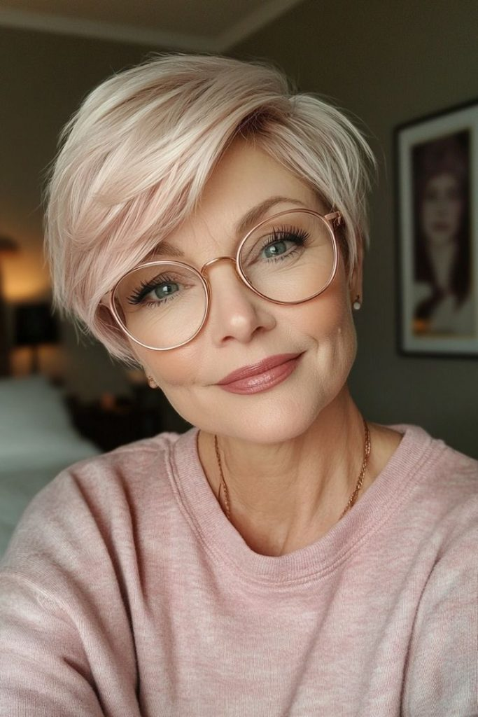 Delicate pink pixie with side-swept layers adds elegance and playful color. Lightweight mousse creates texture, and pairing with glasses adds chic sophistication for fine wavy hair.
