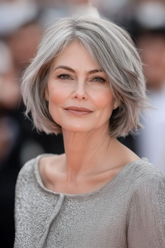 Silver-grey bob with textured ends adds youthfulness and polish. Round-brush styling gives slight inward curl, enhancing grey tones and versatility for casual or formal occasions.