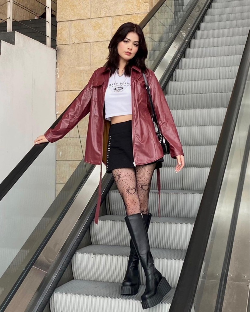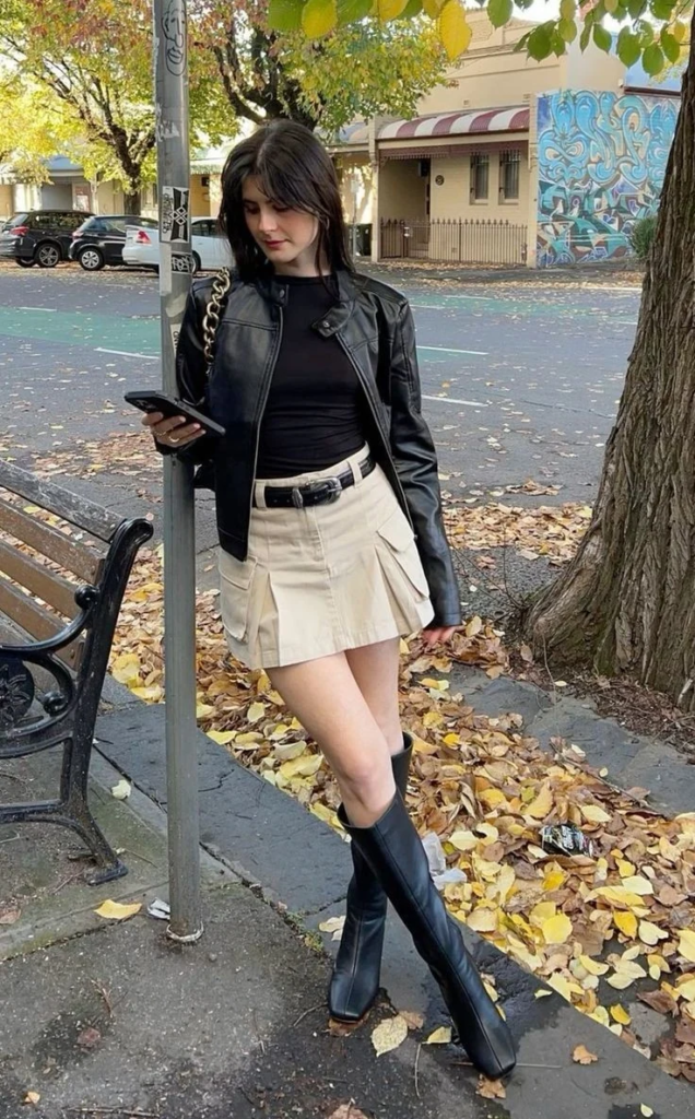 The oversized leather jacket adds warmth and a strong concert vibe. It helps trap heat while remaining stylish. The fit keeps layering comfortable. The plaid mini dress brings pattern and personality. Tights help maintain warmth without altering the look. The contrast keeps the outfit dynamic.This combination works across different concert styles. It balances comfort with visual interest. Ideal for cold-weather events.