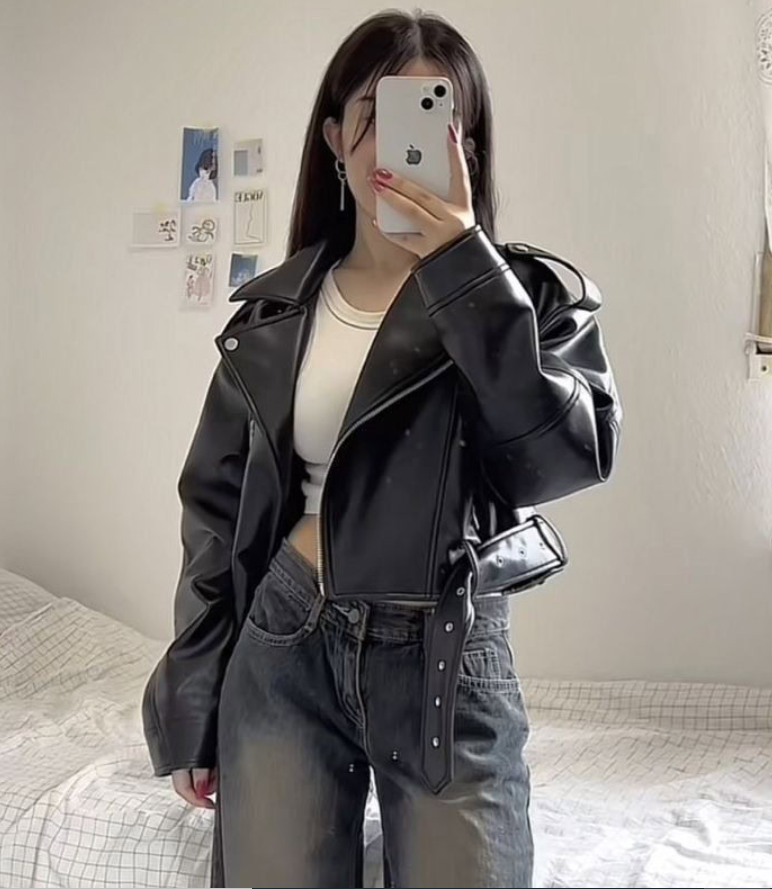 The black leather jacket provides insulation. It balances the bold red top. The contrast stands out. Dark bottoms and boots keep the look grounded. Warmth remains consistent. The outfit feels cohesive. It’s confident and eye-catching. Suitable for winter venues. Comfortable and stylish.