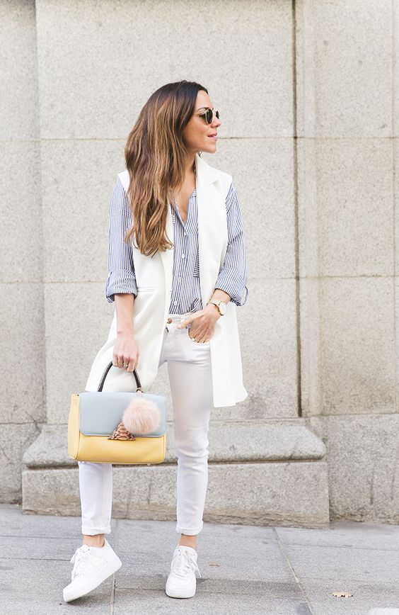 Stripes are timeless, and pairing them with sneakers adds a casual elegance. A blue-and-white striped shirt under a cream sleeveless blazer, matched with slim-fit white jeans, gives me a polished yet relaxed vibe.