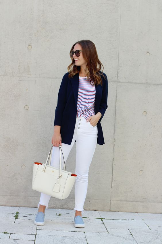 I often embrace nautical inspiration—navy blazers over striped tops, white skinny jeans, and soft blue sneakers. Textures like wool and denim add depth.