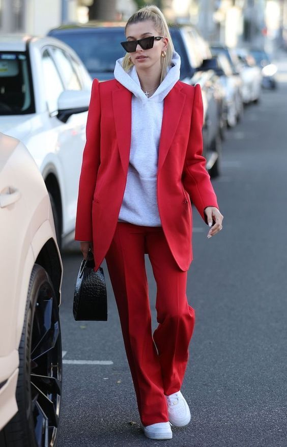 For days I want to feel bold, I go for a red pantsuit with a white hoodie. White sneakers balance the look, turning heads while keeping it casual.