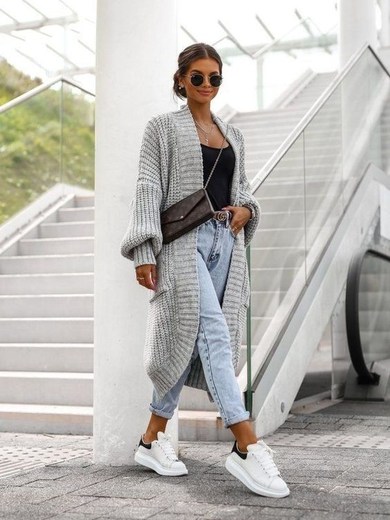 Comfort doesn’t have to sacrifice style. My go-to is an oversized grey knit cardigan, light-wash jeans, and white sneakers. It’s the perfect casual-chic combo for coffee dates or relaxed office days.