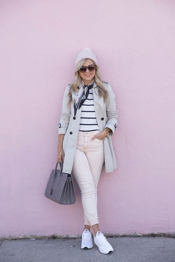 Soft pastels instantly lift my mood. Beige coats, striped tops, and pale pink jeans with white sneakers create a light, fresh look perfect for spring.