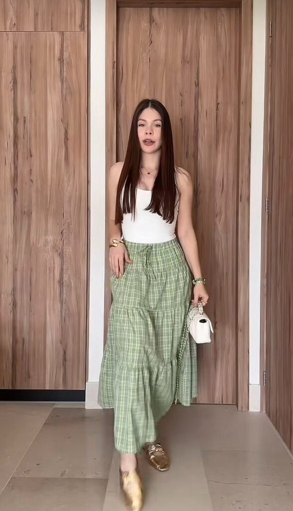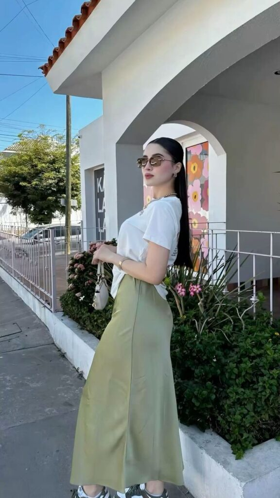 I see this as one of the easiest outfits to put together. The soft green skirt does most of the work while the white tee keeps it simple. It’s perfect for days when I want to look good without spending time planning.