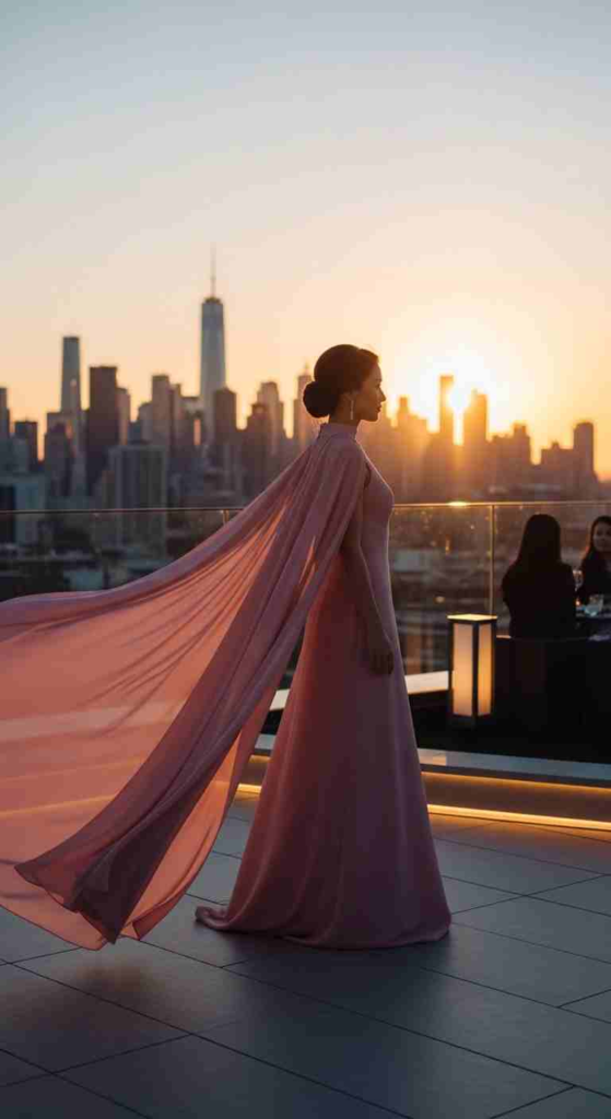 The blush column dress is minimal, but the cape adds drama. This combination works well for entrance moments and photos.