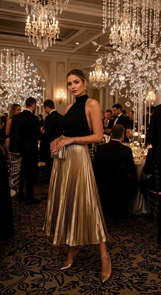 Gold pleats bring movement and shine without feeling too heavy. The black top grounds the outfit and keeps it formal.