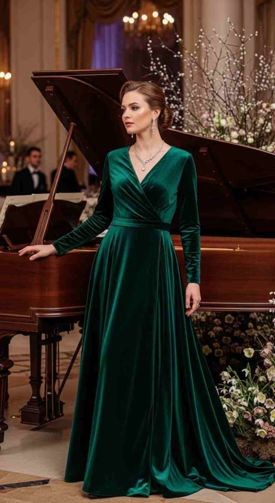 Emerald velvet is a timeless gala fabric choice. The wrap design enhances shape and comfort.