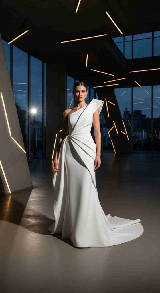 A white asymmetric gown gives a clean, architectural feel. The one-shoulder cut creates visual interest.