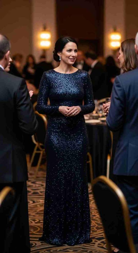 This is a reliable choice for formal indoor galas where lighting enhances sequins.