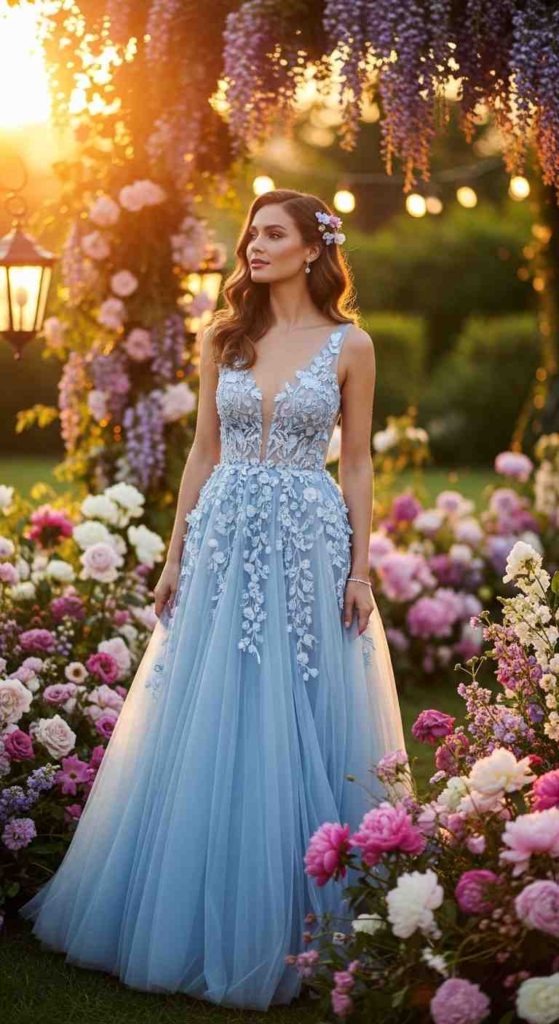 This powder blue tulle gown brings a soft romantic feel that fits spring evenings perfectly. The layered tulle creates natural movement while floral appliqués add texture without feeling heavy. Silver heels and light jewelry keep the focus on the dress. This works well for charity galas or museum events where elegance and softness are preferred.