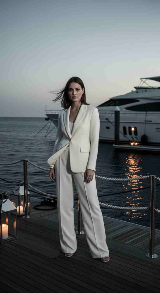 An ivory pantsuit is a strong modern choice for Spring 2026 Gala Outfit Ideas. The wide-leg tailoring gives structure while the satin camisole softens the look. I’ve noticed monochrome outfits like this are becoming more common because they look clean in photos. Nude heels and minimal gold accessories complete the outfit.