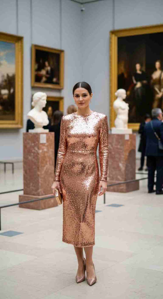 This rose gold sequin midi dress balances sparkle and sophistication. The midi length keeps it modern, while long sleeves add coverage. It works well for semi-formal gala events where full gowns are not required. Nude pumps are the safest styling choice to avoid competing with the shine.