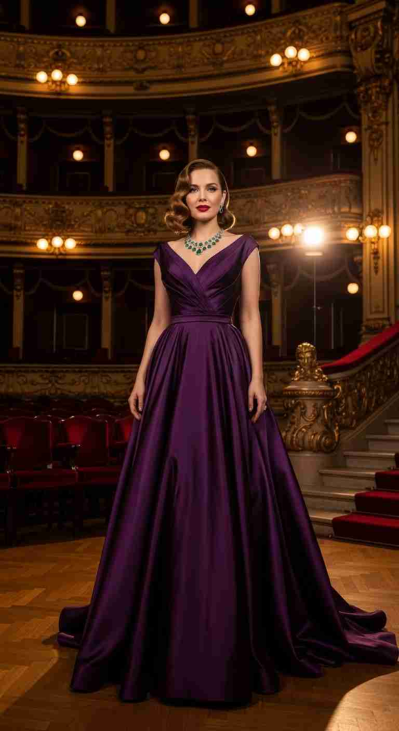 Deep purple satin creates a rich, luxurious look without being too loud. The wrap design helps shape the waist naturally and feels comfortable for long events. In 2026 styling trends, jewel tones like this remain reliable for evening galas. Soft waves or a low bun complete the look.