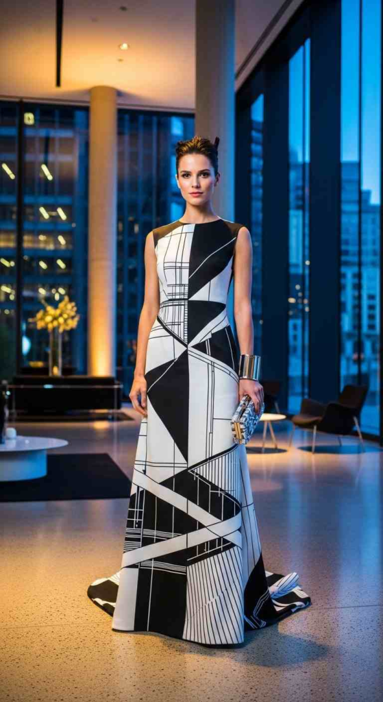 This gown stands out because of its bold contrast design. Black and white color blocking gives a modern art-inspired feel. The clean structure works best with sleek hairstyles and minimal accessories. It’s ideal for fashion-forward gala environments.