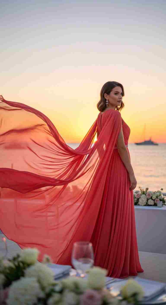 Coral chiffon is a fresh spring color that feels light and energetic. Cape sleeves add movement and drama without making the outfit heavy. Gold jewelry enhances the warm tone of coral. This is a strong choice for outdoor or evening spring galas.
