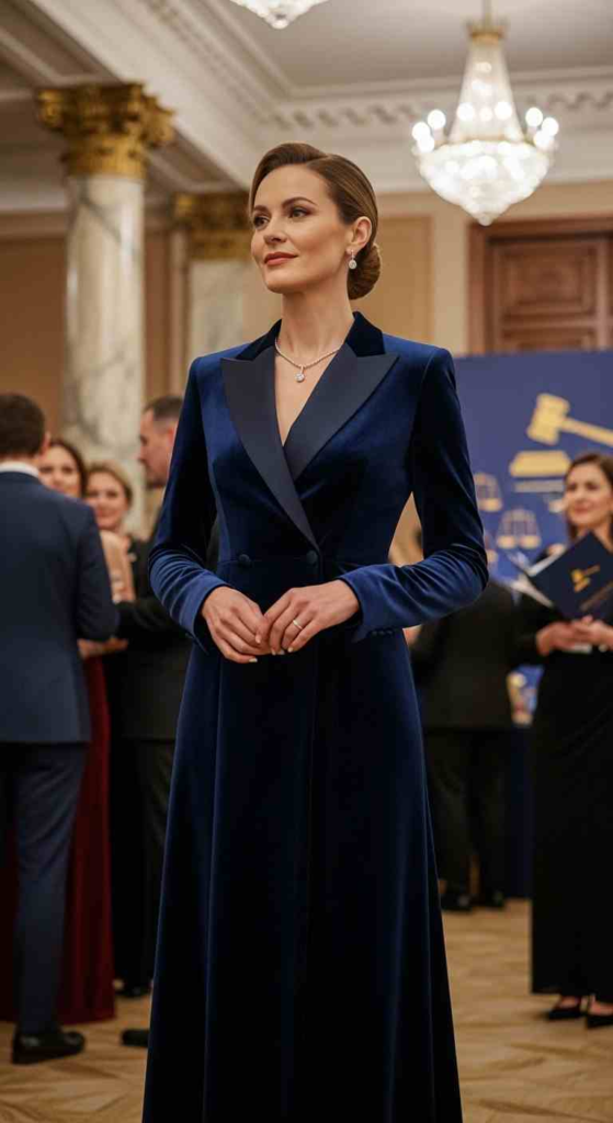 This tuxedo-style dress blends masculine tailoring with feminine shape. The velvet texture adds depth while satin lapels keep it formal. It works especially well for corporate galas or winter-spring transition events. Classic pumps keep the look grounded.