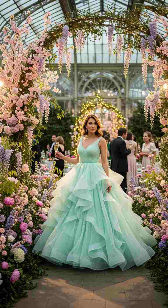 Mint green organza feels fresh, soft, and very spring-appropriate. The ball gown structure adds volume while the color keeps it light. Silver accessories help maintain a balanced tone. This is a classic “princess-style” gala outfit.
