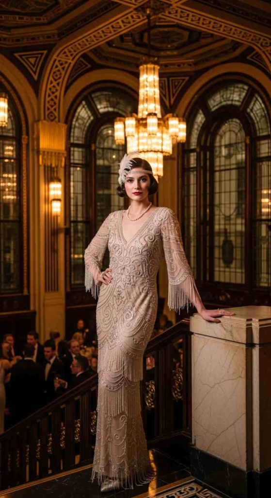 A fully beaded champagne dress reflects light beautifully in evening settings. The column shape creates a sleek, elongated silhouette. Vintage-inspired waves and gold jewelry complete this old-Hollywood style look. This is a strong choice for formal black-tie galas.
