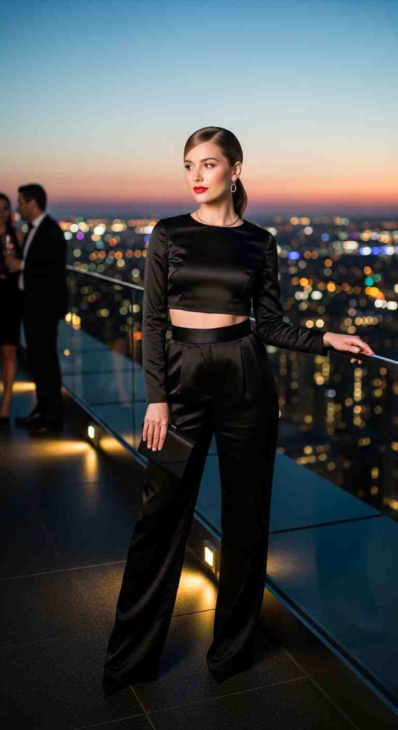 A coordinated black silk set offers flexibility and modern elegance. The crop top and maxi skirt combination feels contemporary but still formal. It’s a practical option for those who want movement without wearing a full gown. Statement earrings elevate the outfit.