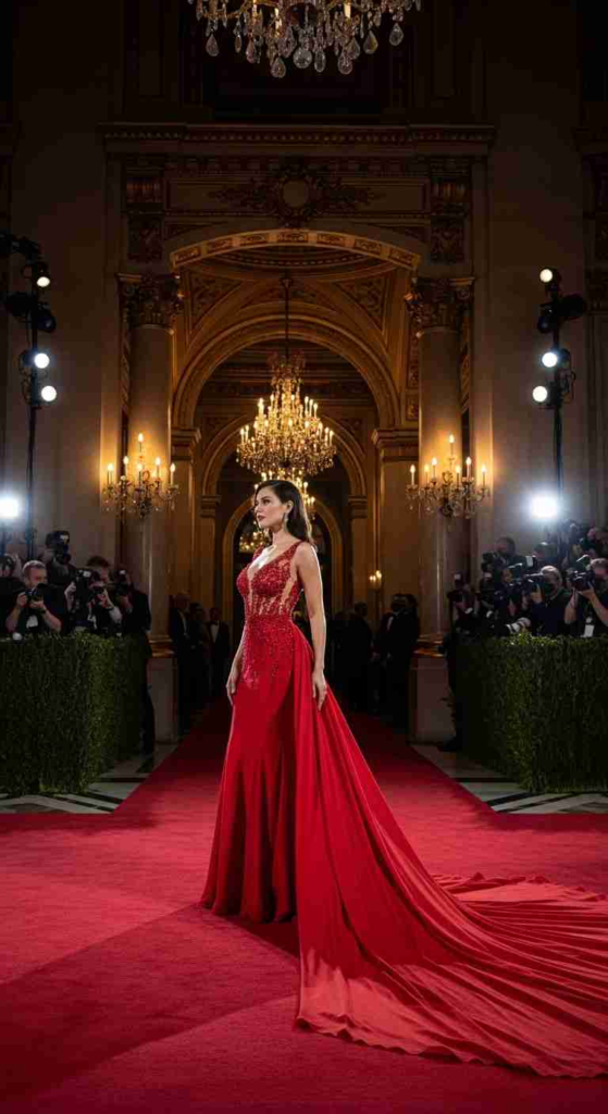 This red mermaid gown is designed for maximum impact. The fitted shape enhances structure while the train adds drama. Red remains one of the strongest gala colors because it photographs well under warm lighting. A bold lip and gold accessories complete the statement look.