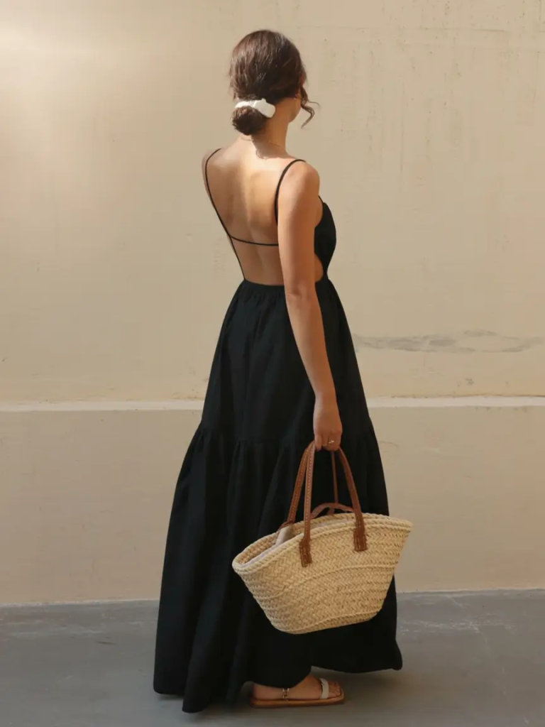 Black maxi dresses work for spring when designed with light fabrics and strategic cuts. Strappy, backless styles offer subtle drama while remaining breathable and elegant.