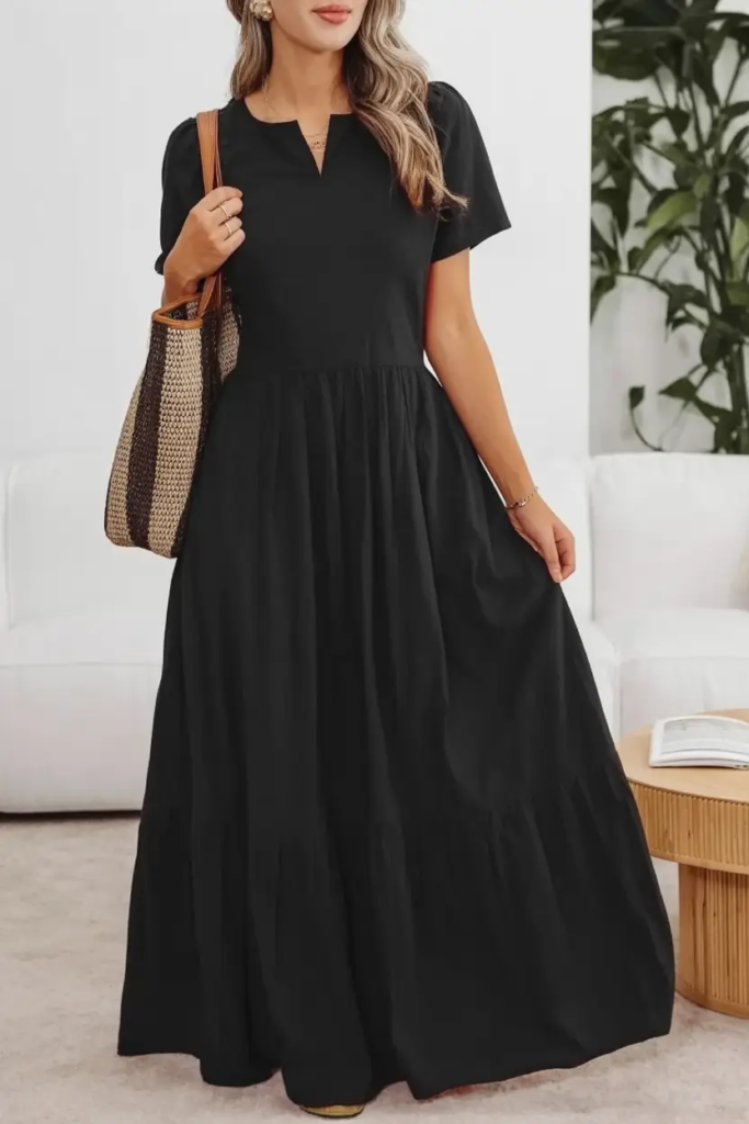 Short-sleeve black maxis provide simplicity and versatility. Gathered skirts and notched necklines maintain visual interest, making the look grounded and practical.