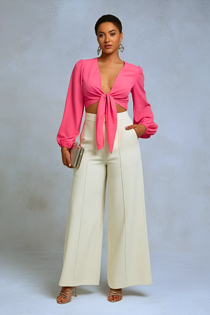 A neon tie-front blouse with white wide-leg trousers makes a bold dinner outfit. Geometric earrings, strappy heels, and a sleek clutch complete the modern look.