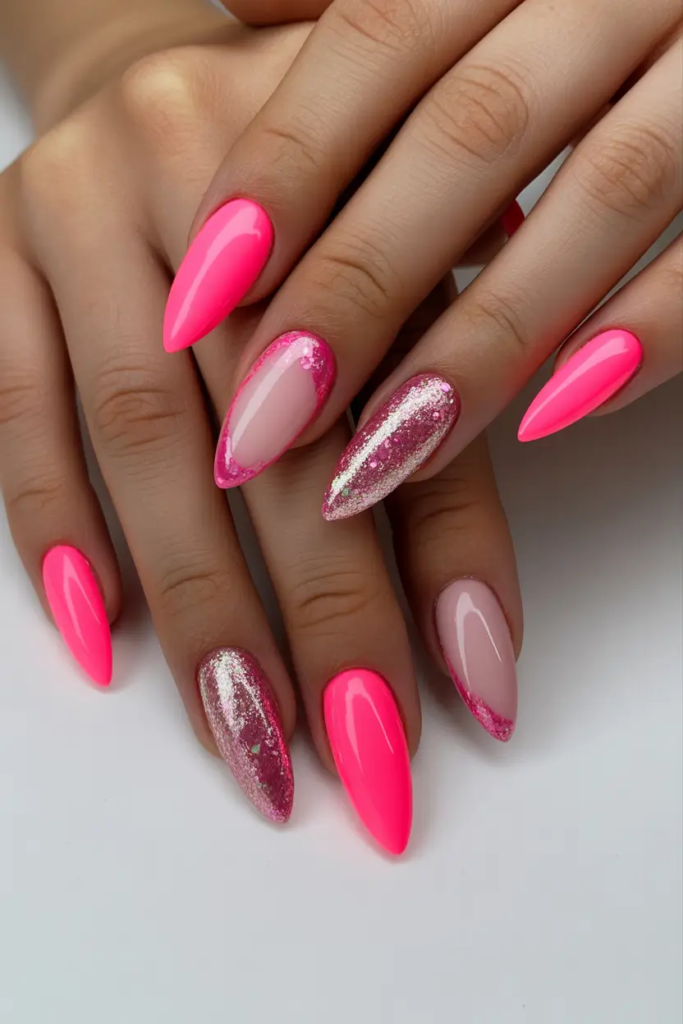 I always come back to almond-shaped nails when I want something clean but eye-catching. This shape naturally elongates fingers, and when I pair it with neon hot pink, it instantly feels like spring.