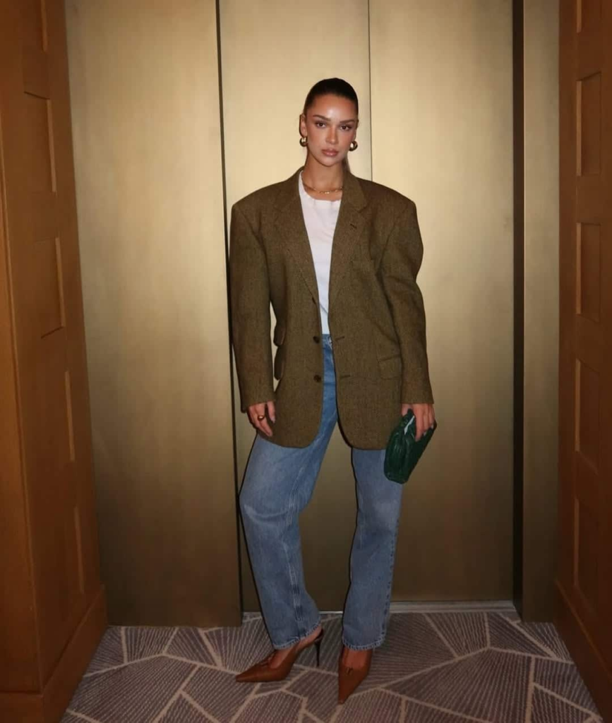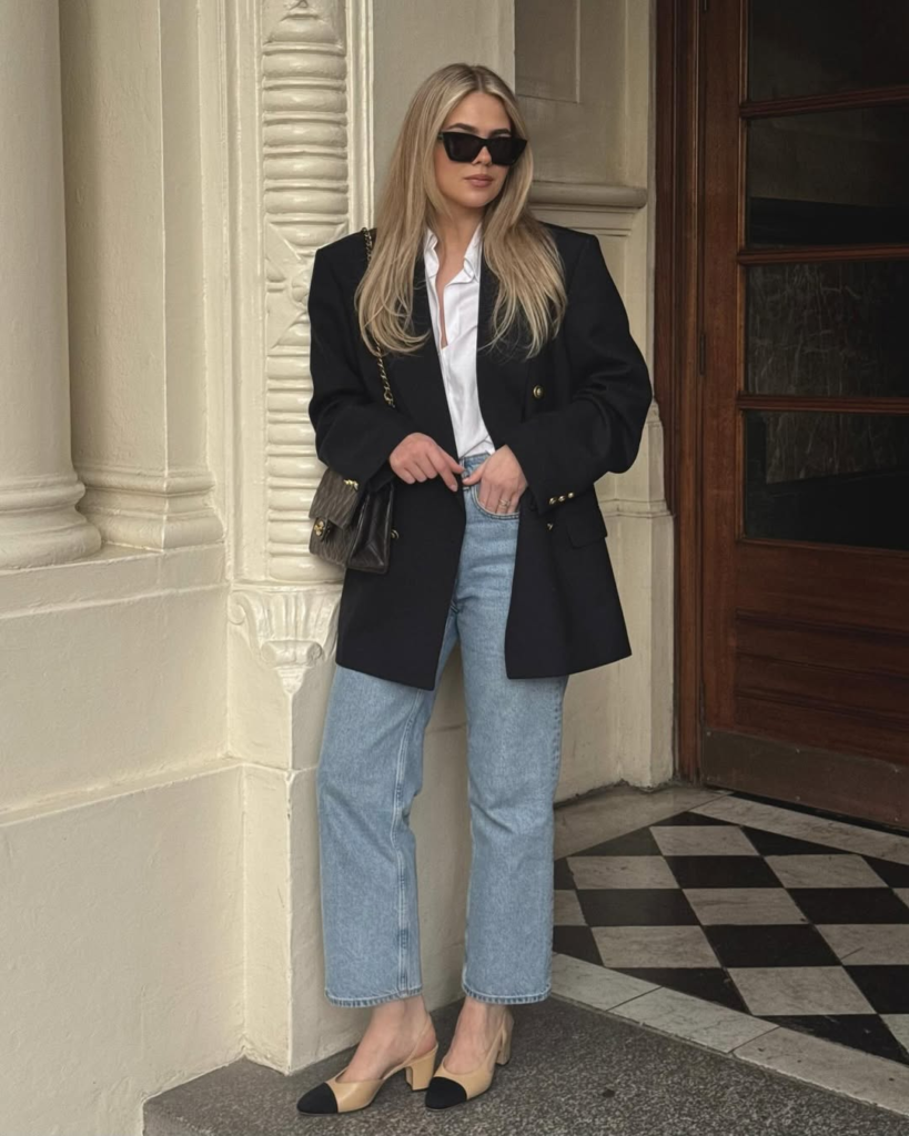 An oversized blazer softens the formality of traditional tailoring. Light-wash denim keeps the look relaxed and modern. The outfit feels effortless but still well thought out. It’s comfortable, current, and easy to style across seasons.