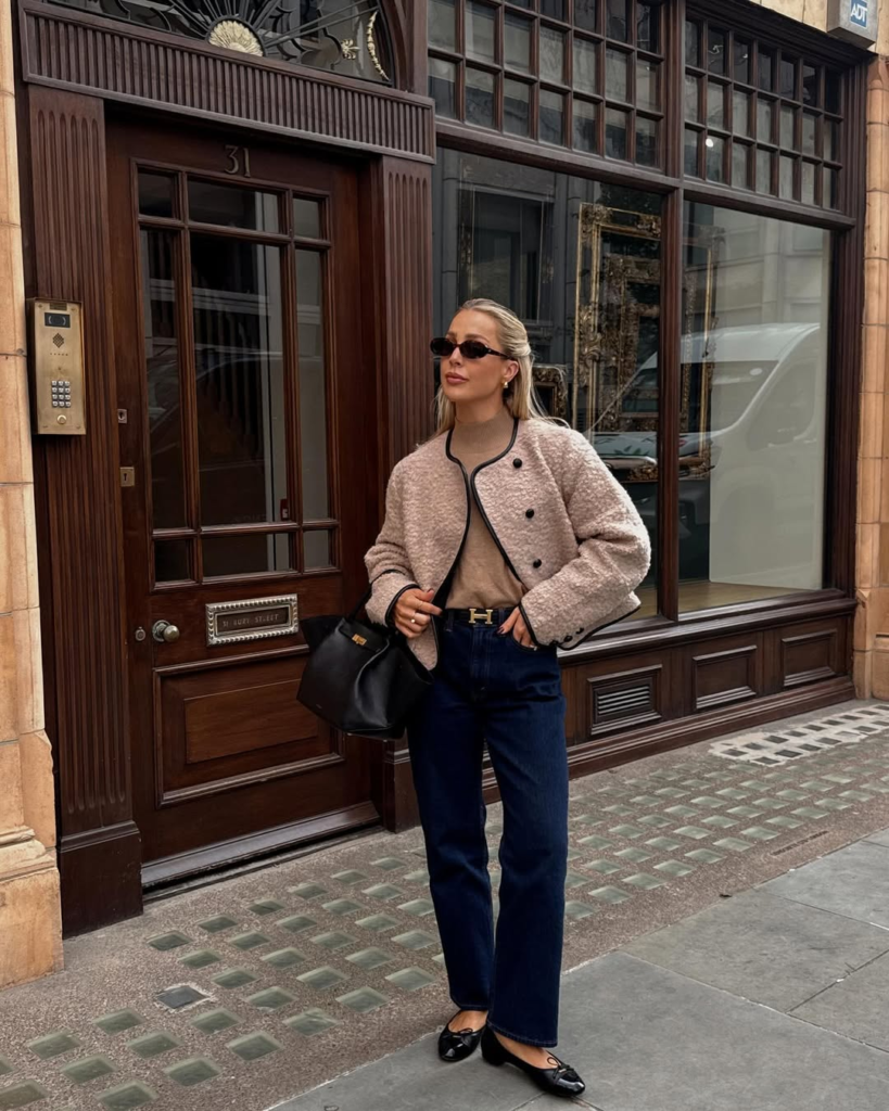 Tweed adds richness and character to simple denim. When paired with straight-leg jeans, it creates a balance between elegance and ease. The contrast between textured fabric and casual denim makes the outfit feel complete. This look feels classic, thoughtful, and effortlessly stylish.
