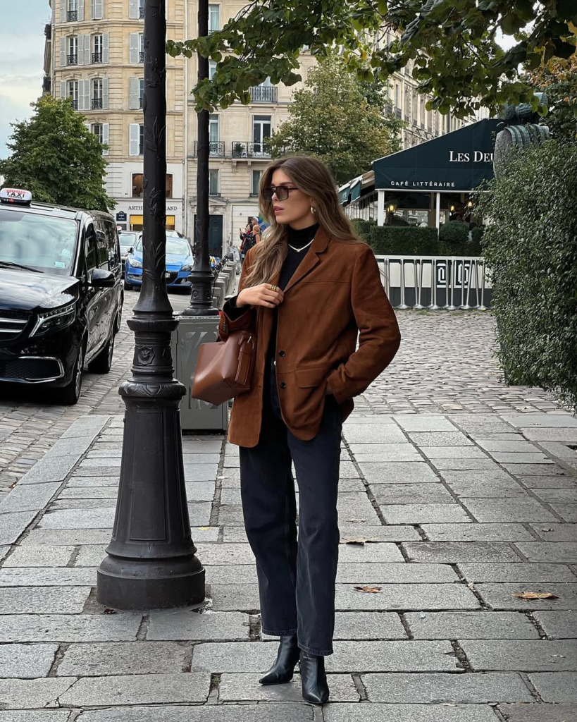 Straight-leg jeans and a blazer work because they balance structure and ease perfectly. The blazer sharpens the look, while the jeans keep it approachable and wearable. This combination feels clean, intentional, and timeless without being overdone. It’s an outfit that adapts easily from daytime to evening.