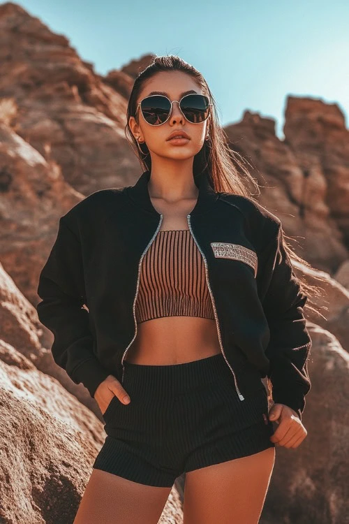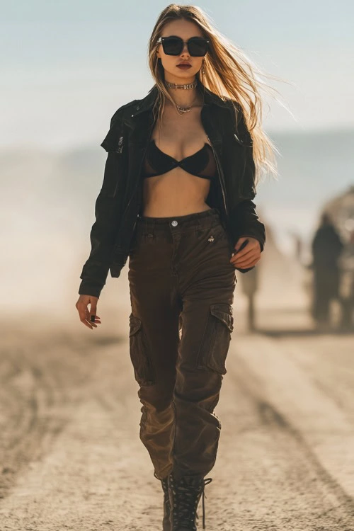 When I want an edgy look, I go for a black bralette with cargo pants and a cropped moto jacket.