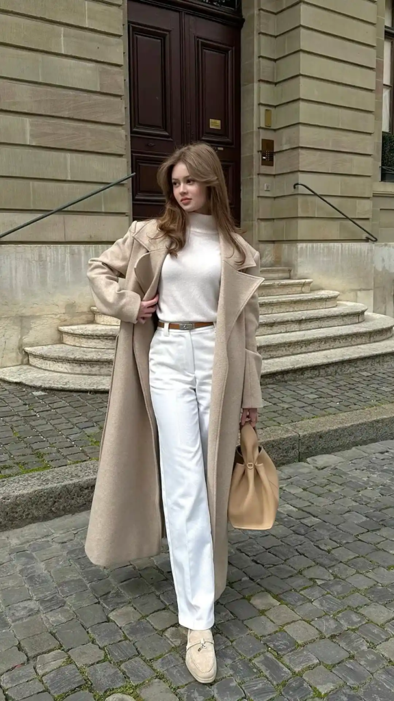14. Elegant Beige Coat and White Ensemble